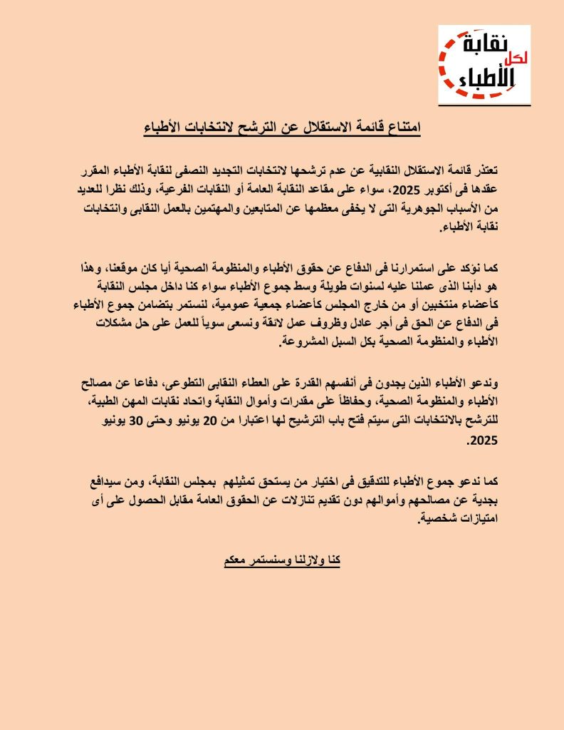 وكانت قائمة الاستقلال قد أعلنت في بيان رسمي امتناعها عن خوض انتخابات نقابة الأطباء القادمة، مشيرة إلى أن قرارها جاء بعد دراسة للأوضاع النقابية الحالية وحرصًا على استمرار الدفاع عن حقوق الأطباء خارج إطار الترشح. ودعت الأطباء إلى اختيار من يملك الكفاءة والاستقلالية، دون التنازل عن الحقوق أو الخضوع للمصالح الشخصية.