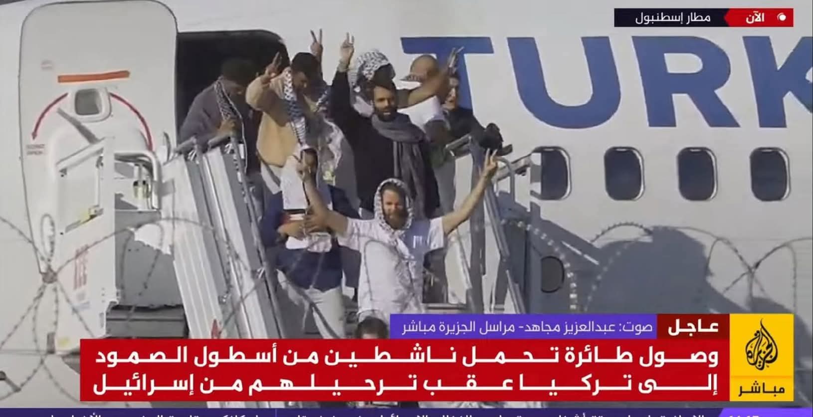 وصلت اليوم السبت طائرة تحمل المرحلين من إسرائيل وكانوا على متن أسطول الصمود إلى تركيا، وفي وقت سابق أعلنت وزارة الخارجية الإسرائيلية، ترحيل 137 ناشطًا من أسطول الصمود المتجه إلى قطاع غزة إلى تركيا.