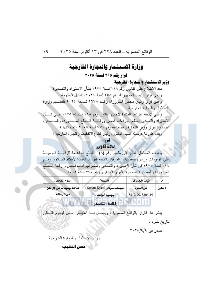 نشرت الوقائع المصرية في عددها رقم 228 الصادر بتاريخ 13 أكتوبر 2025، قرار وزارة الاستثمار والتجارة الخارجية رقم 395 لسنة 2025، بشأن إعلان رسوم فحص واردات صبغات “سودان” بجميع أنواعها.