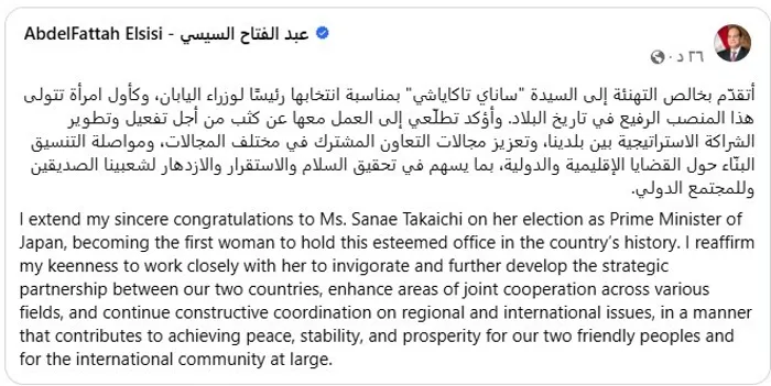 هنأ الرئيس عبد الفتاح السيسى، “ساناي تاكاياشي” بمناسبة انتخابها رئيسًا لوزراء اليابان، وكأول امرأة تتولى هذا المنصب الرفيع في تاريخ البلاد.