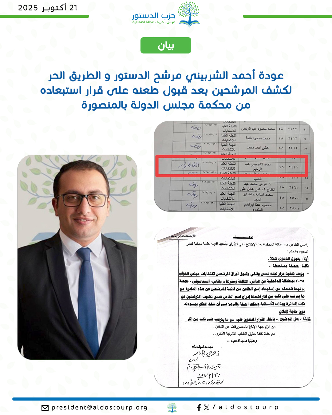 محكمة القضاء الإداري تعيد مرشح “الدستور والطريق الحر” أحمد الشربيني إلى سباق الانتخابات في الدقهلية