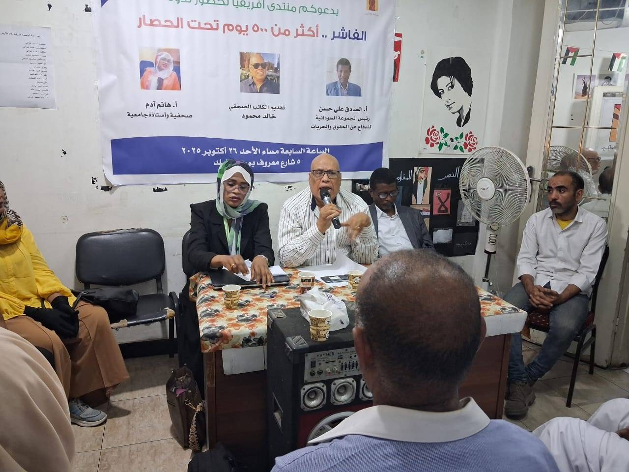 نظم منتدى أفريقيا بحزب التحالف الشعبي الاشتراكي ندوة بمقر الحزب بوسط القاهرة، بمشاركة عدد من المهتمين بالشأن السوداني من مصريين وسودانيين، وأدارها الكاتب الصحفي خالد محمود. وشهدت الندوة مناقشات موسعة حول الأوضاع الإنسانية الصعبة في مدينة الفاشر بالسودان، حيث أشاد المتحدثون بصمود سكان المدينة في مواجهة الحصار المفروض عليهم، مؤكدين أن تجويع المدنيين واستخدام الحصار كأداة حرب يمثل انتهاكًا صارخًا للقيم الإنسانية والأخلاقية.