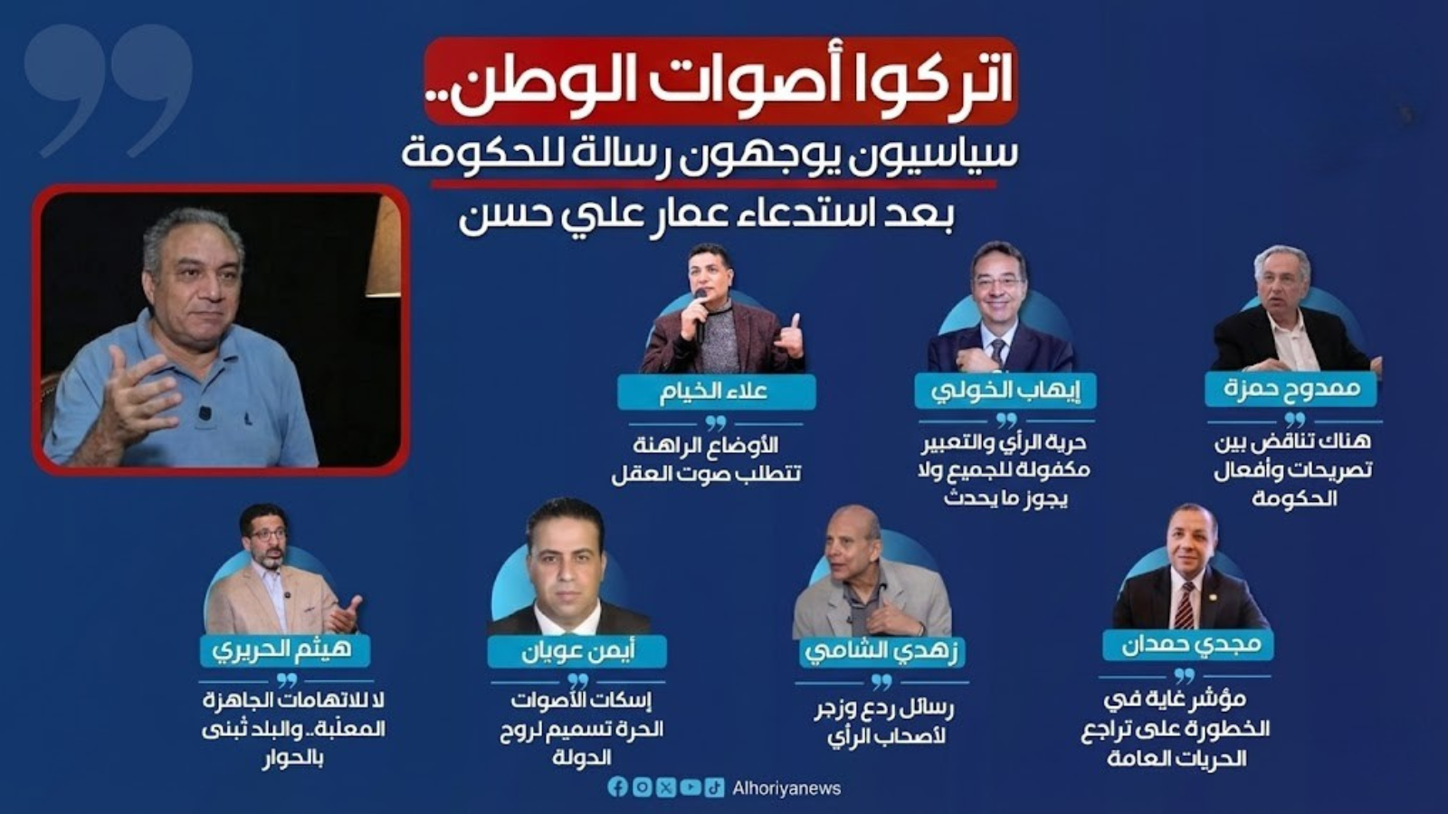 وجّه عدد من السياسيين والمثقفين رسالة مباشرة إلى الحكومة، تحت عنوان «اتركوا أصوات الوطن»، عقب استدعاء المفكر والباحث عمار علي حسن، محذرين من تداعيات التضييق على حرية الرأي والتعبير، ومؤكدين أن المرحلة الراهنة تتطلب فتح المجال أمام الحوار والاستماع للأصوات الوطنية بدلًا من ملاحقتها.