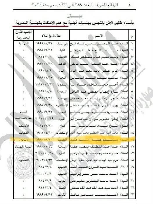 وبحسب البيان المنشور في الوقائع المصرية – العدد 239 بتاريخ 23 ديسمبر 2025، فقد جاء تحت عنوان: