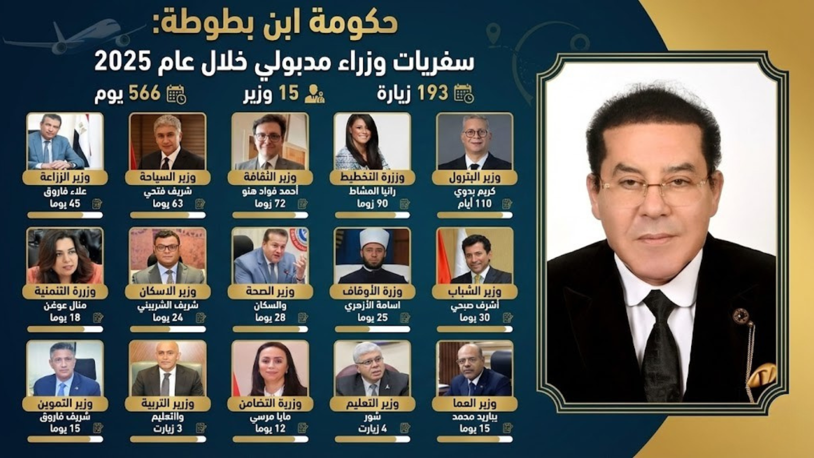 وأوضح نور، تعليقًا على إنفوجراف متداول، أن البيانات تشير إلى تنفيذ 193 جولة وزارية خارجية خلال عام 2025، استغرقت إجمالًا 566 يومًا، وهو ما يتجاوز عدد أيام العام نفسه، البالغ 365 يومًا، في دلالة على كثافة غير مسبوقة في السفر الرسمي.