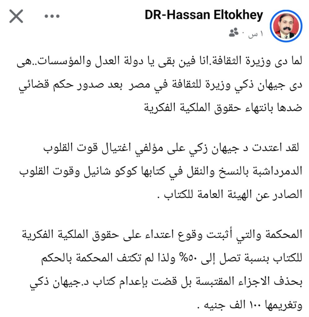 كشف الدكتور حسن الطوخي رئيس الجمعية المصرية للأدباء والفنانين والصحفيين عبر صفحته الرسمية على موقع فيسبوك عن اعتراضه الشديد على تعيين جيهان ذكي وزيرة الثقافة المصرية في التعديل الوزاري الأخير وتساءل بمرارة عن موقعه كفنان مبدع في ظل دولة العدل والمؤسسات التي تمنح حقيبة الثقافة لشخصية صدر ضدها حكم قضائي نهائي يثبت انتهاء حقوق الملكية الفكرية في أعمالها المنشورة.