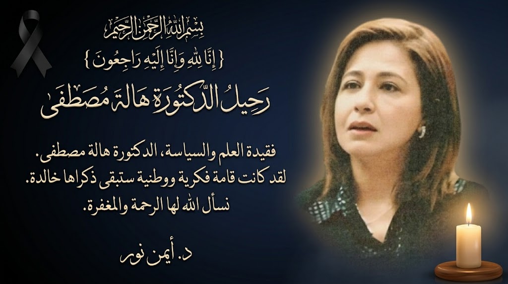 ينعى الدكتور أيمن نور، رئيس حزب غد الثورة الليبرالي المصري، ببالغ الحزن والأسى، وباسمه وباسم قيادات وأعضاء الحزب، الراحلة الدكتورة هالة مصطفى، التي انتقلت إلى رحمة الله تعالى بعد معاناة قصيرة مع المرض.