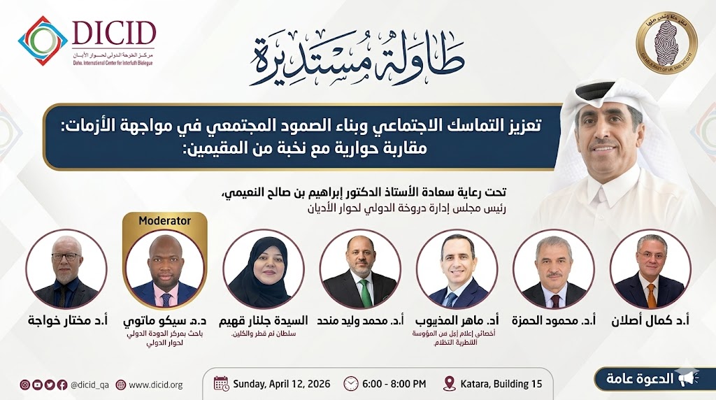 وأشار إلى أن الطاولة المستديرة تُعقد يوم الأحد 12 أبريل 2026، من الساعة السادسة مساءً إلى الثامنة، في الحي الثقافي كتارا – قاعة مبنى 15، بمشاركة نخبة من الخبراء والمتخصصين وصنّاع الرأي، وتحت رعاية الأستاذ الدكتور إبراهيم بن صالح النعيمي، رئيس مجلس إدارة مركز الدوحة الدولي لحوار الأديان، وبحضور شخصيات وطنية وقيادات مجتمعية بارزة.
