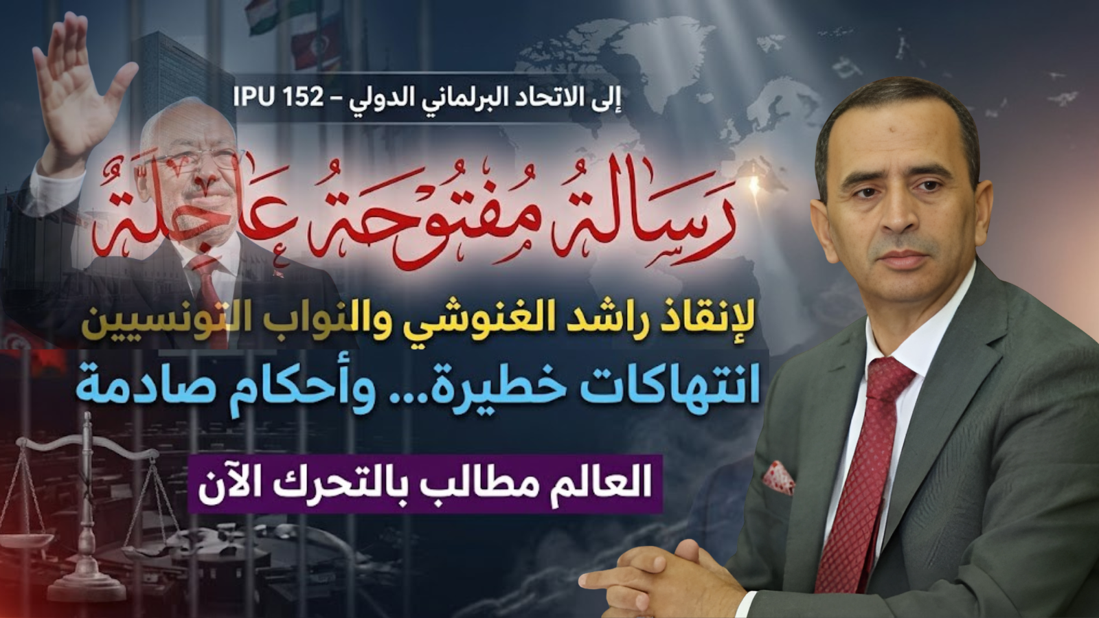 ماهر المذيوب، وجّه رسالة مفتوحة إلى الجمعية العامة 152 للاتحاد البرلماني الدولي، دعا فيها إلى تحرك دولي عاجل وأكثر فاعلية لإنقاذ راشد الغنوشي والنواب المنتخبين التونسيين، وضمان حقوقهم الأساسية وصون كرامتهم.