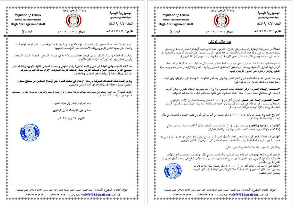 طالبت النقابة مجلس القيادة الرئاسي والمملكة العربية السعودية بممارسة ضغوط قصوى لإرغام الجماعة على صرف المرتبات المنقطعة وإطلاق سراح المختطفين فورا، وحذرت من انهيار شامل للمستقبل التعليمي في ظل استمرار عمليات اقتحام المنازل وترويع الآمنين من الكوادر التربوية التي ترفض الانصياع للتوجهات الطائفية المفروضة بقوة السلاح.